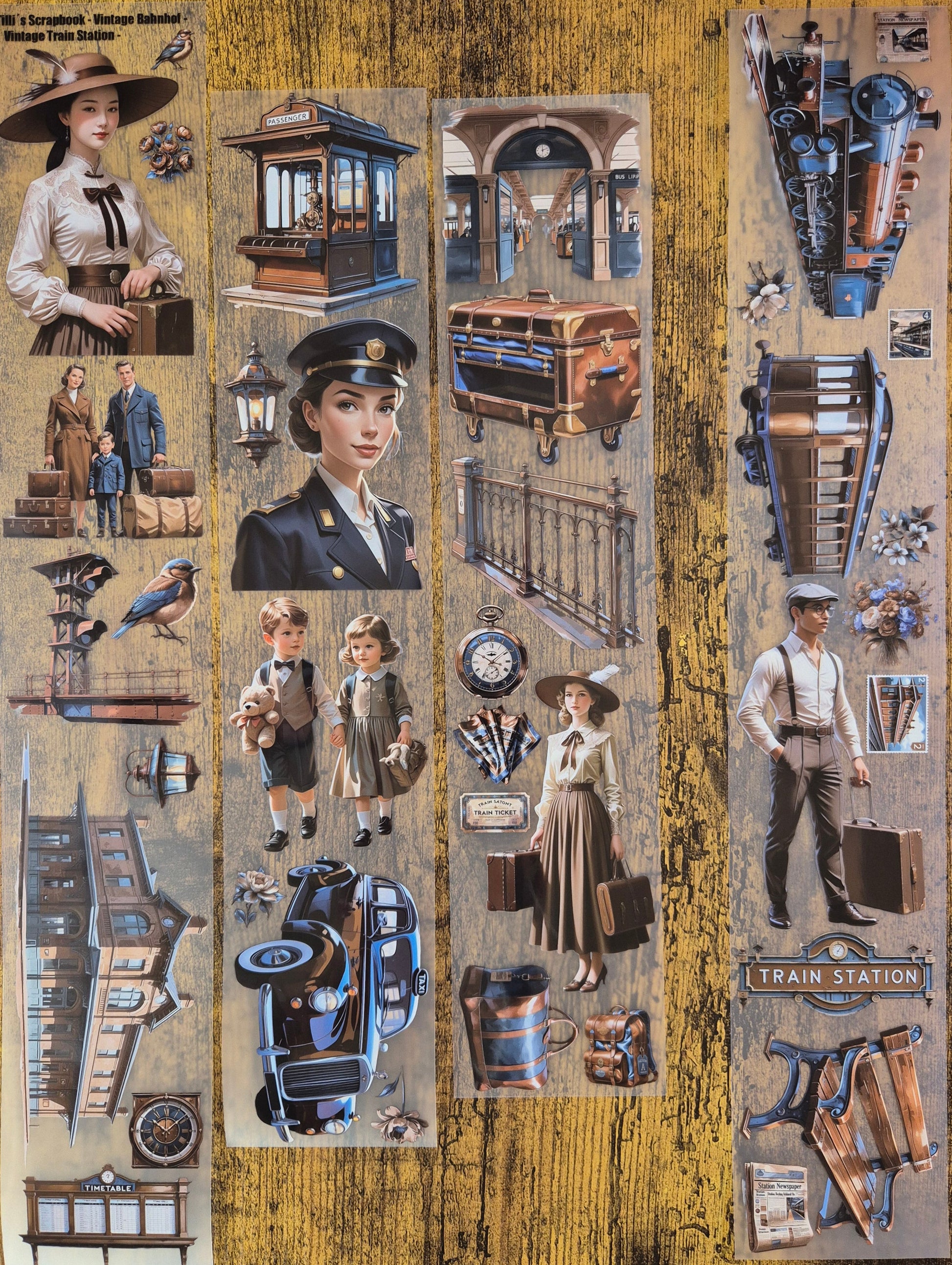 Reise zurück in die gute alte Zeit! Dieses Stickerband im Vintage-Bahnhof-Design mit nostalgischen Motiven wie Zügen, Bahnhofsuhren, Tickets und alten Koffern ist die perfekte Deko für Scrapbooking, Journaling, Kartenbasteln, Planner und kreative DIY-Projekte.
